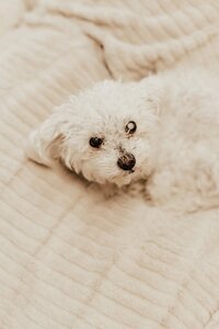 Vi har hund! Detta är Totte. Han är allergivänlig, men om du vill ha ett hundfritt besök är du varmt välkommen att kontakta oss så håller vi fritt från djur ute i salongen.